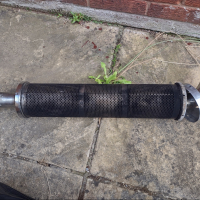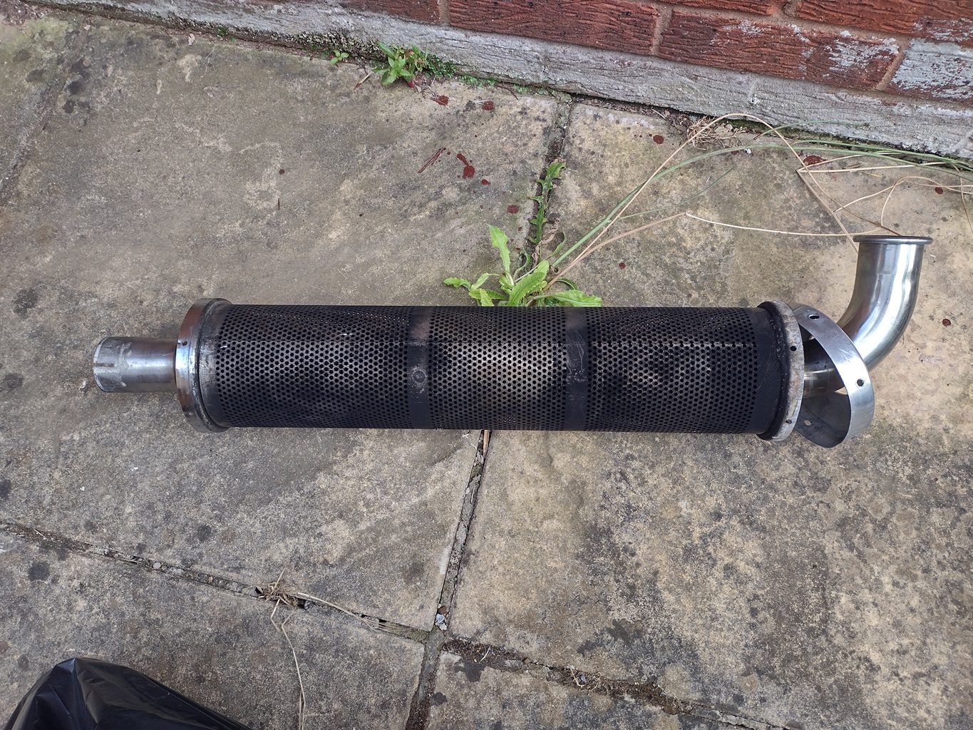 I jumped on the internet and ordered a 5inch diameter piece of stainless exhaust tube, which is flared both ends to allow the old end caps to be used. I also ordered some 2inch diameter perforated stainless tube to run down the middle of the box. This was wrapped with 1.5meters of Acousta-fil exhaust material.