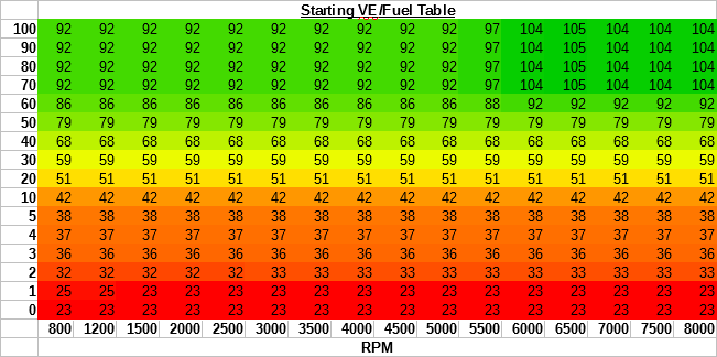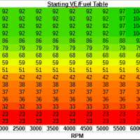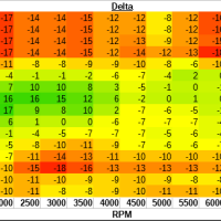 Below is the Volumetric Efficiency (VE) table we started the day with, the table we ended the day with and the difference table showing the changes made. The VE is simply a measure of how much fuel flow the ECU is demanding relative to the amount required to achieve stochiometric mixture at wide open throttle. Technically, if the engine is 100% efficient as an air pump, it would achieve 100% VE across the top of the table.