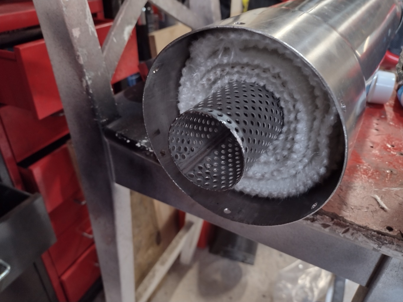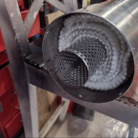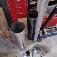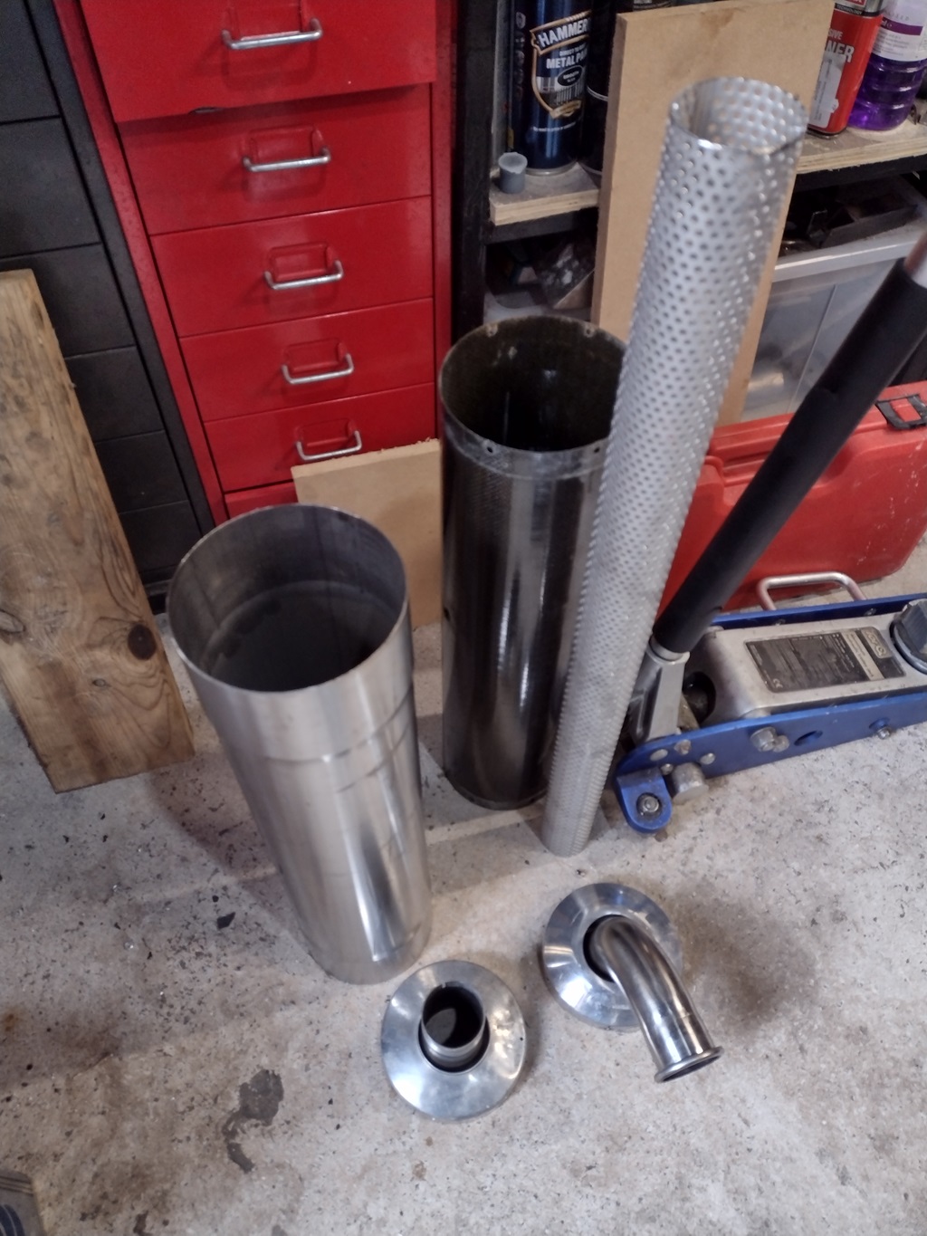 I jumped on the internet and ordered a 5inch diameter piece of stainless exhaust tube, which is flared both ends to allow the old end caps to be used. I also ordered some 2inch diameter perforated stainless tube to run down the middle of the box. This was wrapped with 1.5meters of Acousta-fil exhaust material.