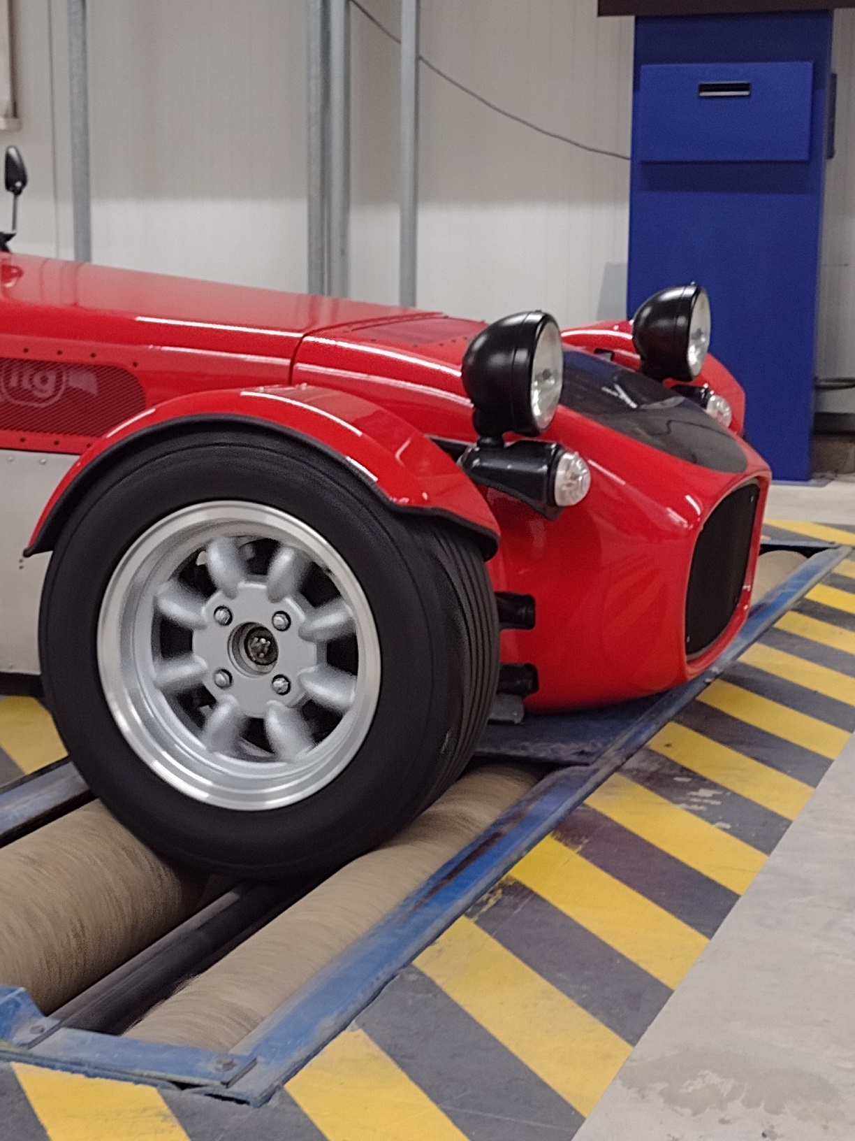 This was the first of two rolling roads that the car would go on during the day. The front and rear axles were tested separately, measuring the peak longitudinal loads they could achieve before locking, and the relevant pedal effort required to achieve those loads. This was also done at a number of increasing pedal loads to give the characteristic of the braking axles. Again, all very impressive and fun to watch.